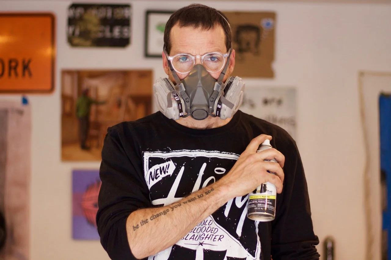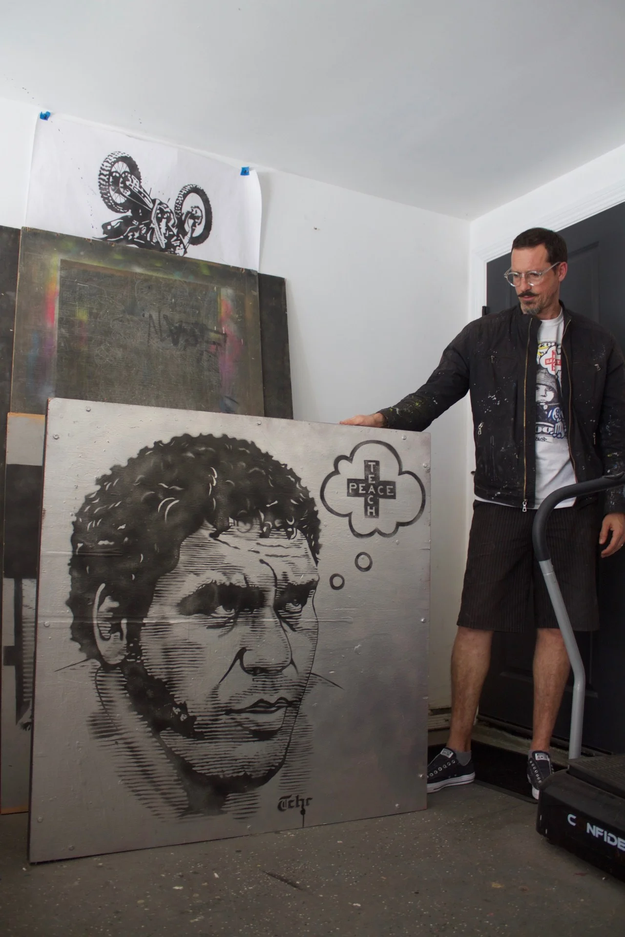 As one of the more prolific artists in Los Angeles, he’s done what many would not even dream to do. He was the first artist to work on a live installation within the walls of the Pentagon in Arlington County, Virginia as well as work with college art students in Zimbabwe. Teachr is currently one of the bigger names in the Los Angeles street art scene due to the consistency and the amount of work he puts in week by week. I recently sat down with Teachr in his Los Feliz studio where we shared half of a sausage wrap and talked about the path that has led him to where he currently is…
